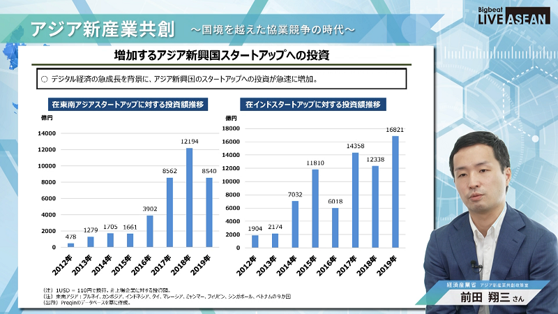 ASEAN(Association of South‐East Asian Nations:東南アジア諸国連合)とは、インドネシア、 カンボジア、シンガポール、タイ、フィリピン、ブルネイ、ベトナム、マレーシア、ミャンマー、ラオスの10カ国による地域政府間組織を指し、この10カ国だけで人口6億6000万人以上、総面積は452万平方キロメートルと、巨大な経済圏を築いています。 経済産業省 アジア新産業共創政策室 室長の前田翔三氏によると、「アジア市場は2000年代に急成長を遂げ、日本メーカーの製造拠点としてではなく、事業拠点として期待が集まるようになりました。その結果、国民1人のGDPも大きく伸びて中間層が拡大、購買力が大きくなりました」と説明します。 そしてASEANが注目されているもう1つの背景にあるのが、デジタル化やスタートアップ投資に対する世界中からの高い期待です。